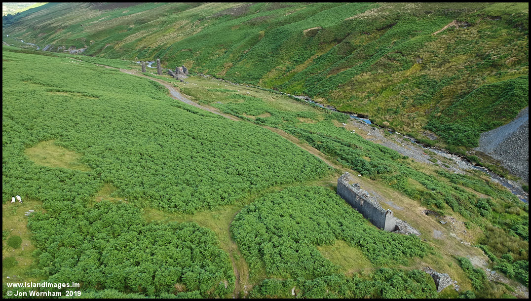 Looking to the east and downstream from the main mine area to the site of a 60 ft water wheel and associated engine house, powered by coal and thought to have been used to pump used water back up to power the wheel during low water levels.