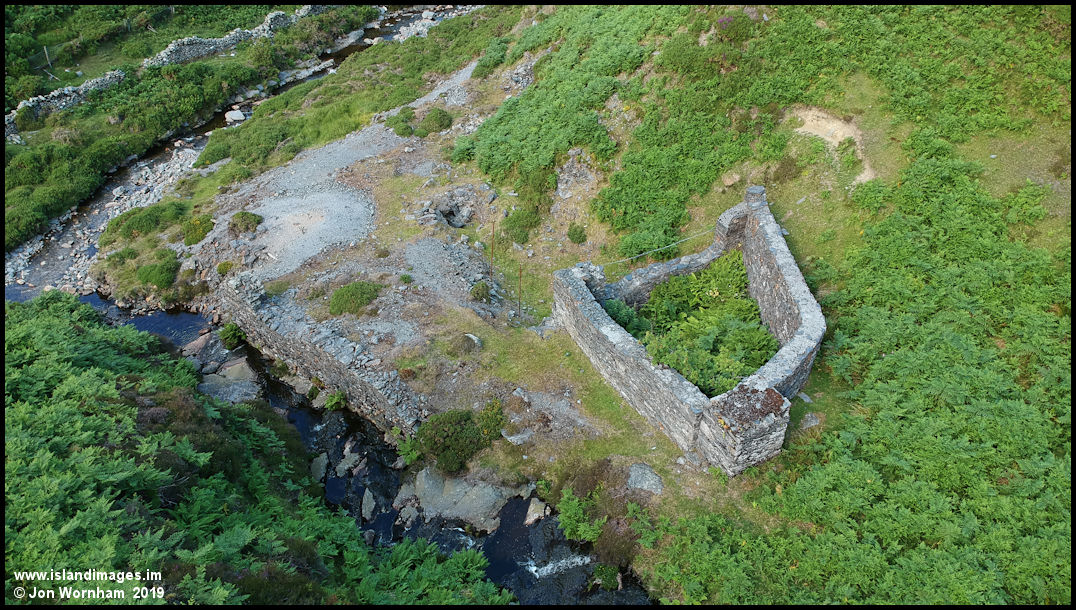 I think that this building must have enclosed the 'new' (north) shaft and pumps. Two poles protruding seem to be all that is left of the attached water wheel case.