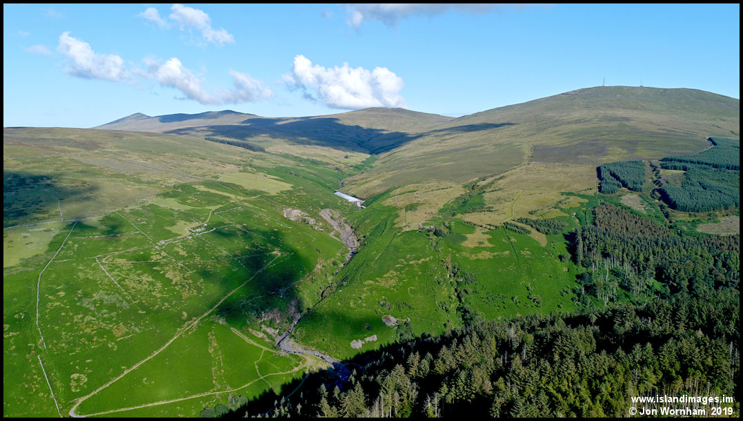 Looking across Sulby Glen to Block Eary reservoir, with Slieaumannagh tholtan on the left and Ballaskella on the right. The bright green is bracken taking over the hillsides and former fields.