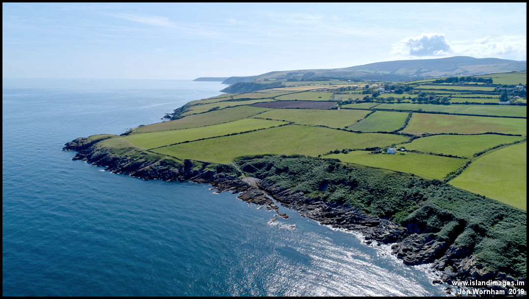 Looking south and rather into sun, along the coastline to the south of Port Mooar. The white house centre right is interesting as there appears to be no road access to it, it might be an uninhabited tholtan.