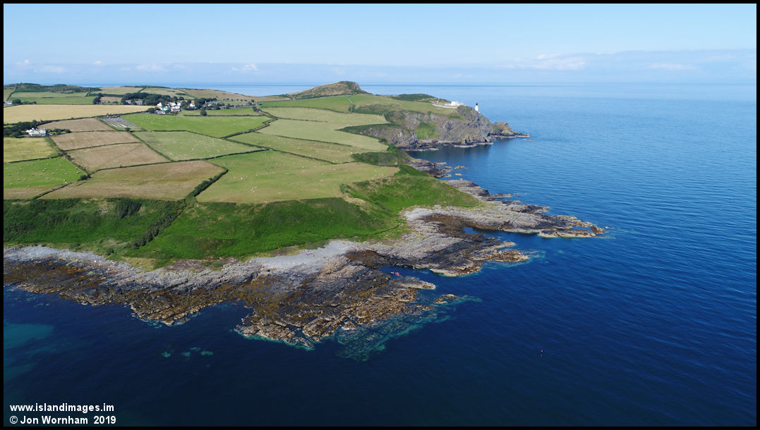 The coastline north of Port Mooar, with Maughold village top left and Maughold Head lighthouse appearing over the rocky headland.