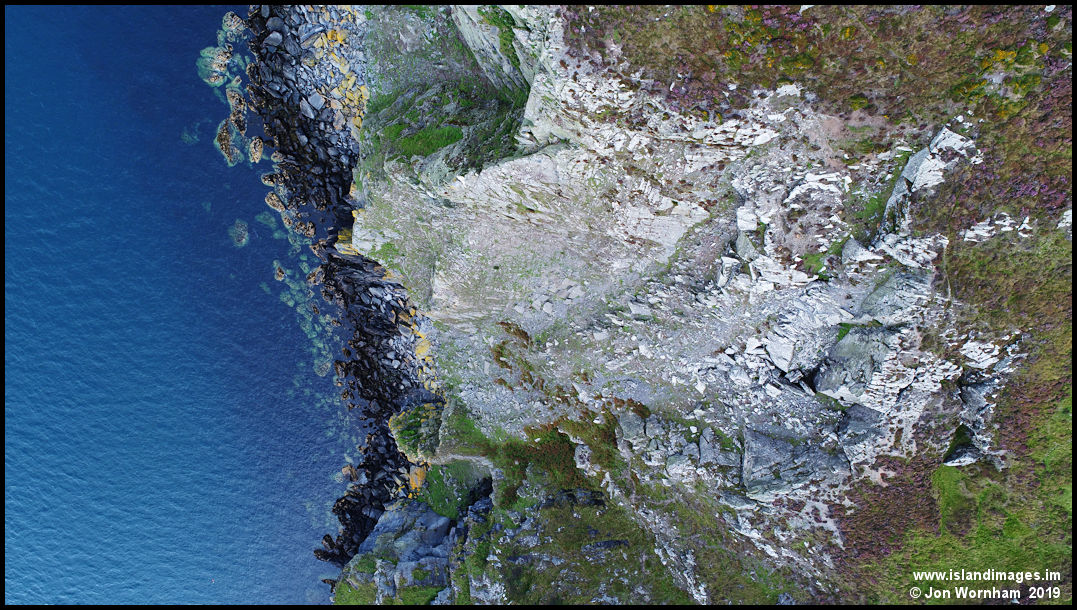 A vertical view of one of the old cliff top slate quarries near Spanish Head.