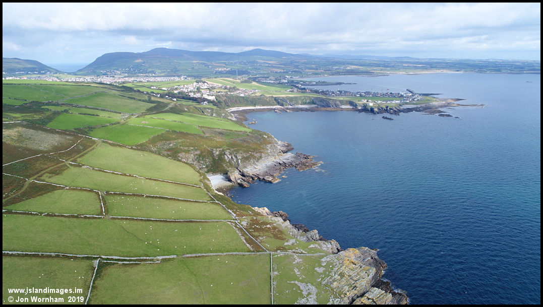 Looking across old stone walled fields to Port St Mary and Port Erin.