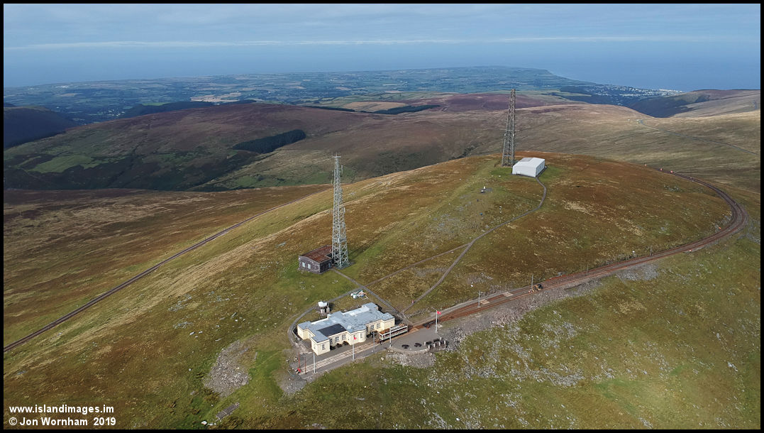 A more vertical view of the Summit Hotel with the Snaefell Mountain Railway tram waiting outside that will take us back down to Laxey.
