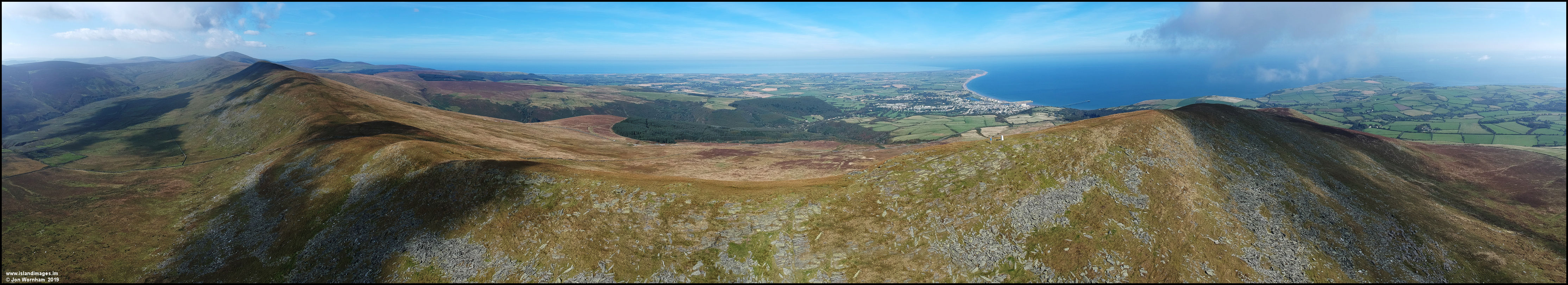 Panorama at North Barrule, with the ridgeline on the left, looking past the summit and Ramsey, with Maughold on the right.
