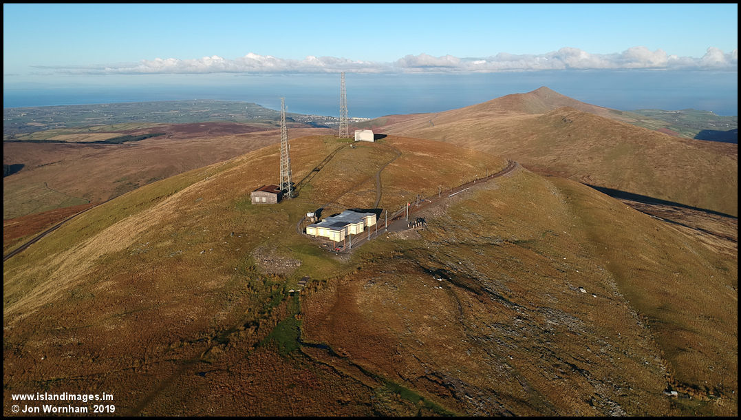 Looking across the summit of Snaefell and along the adjacent ridgeline to North Barrule, with Ramsey just visible behind the far mast.