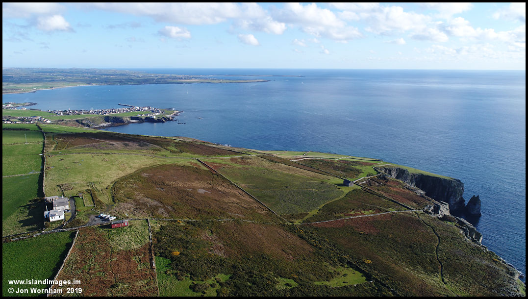 The former coastguard cottages on the hill above Cregneash with The Chasms on the right.