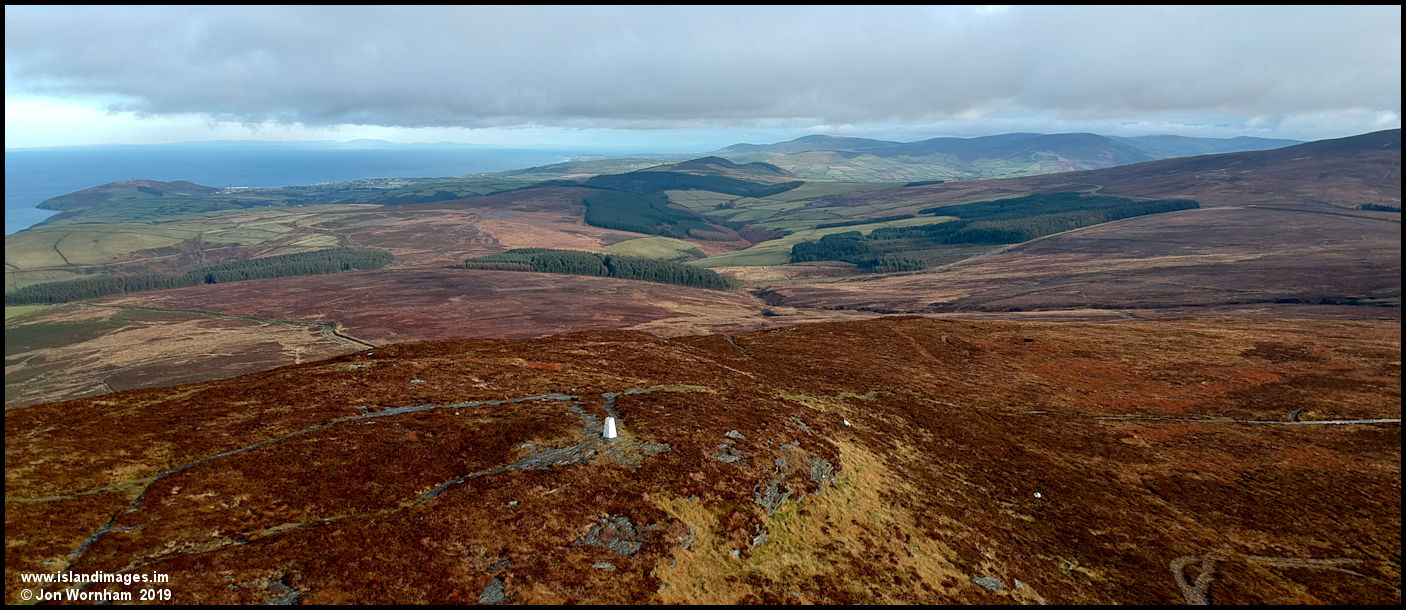 A wider angle view past the trig pillar and across Glen Rushen. The southern Scottish mountains can be seen on the horizon.