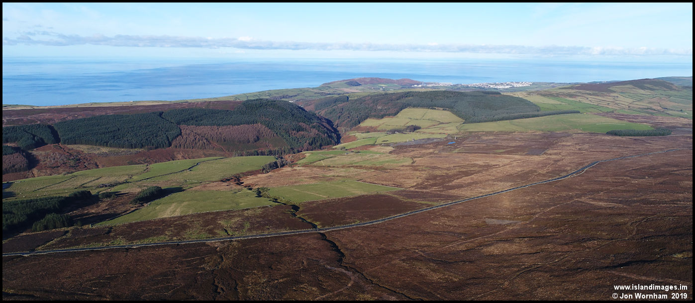 Looking across Glen Rushen from above South Barrule, with Peel in the distance.