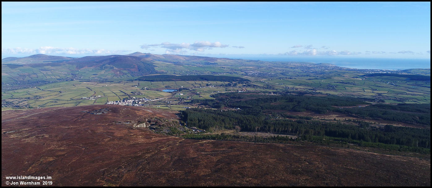Looking across South Barrule quarry to Foxdale. Snaefell is in the centre distance, with Douglas and Onchan visible on the right.
