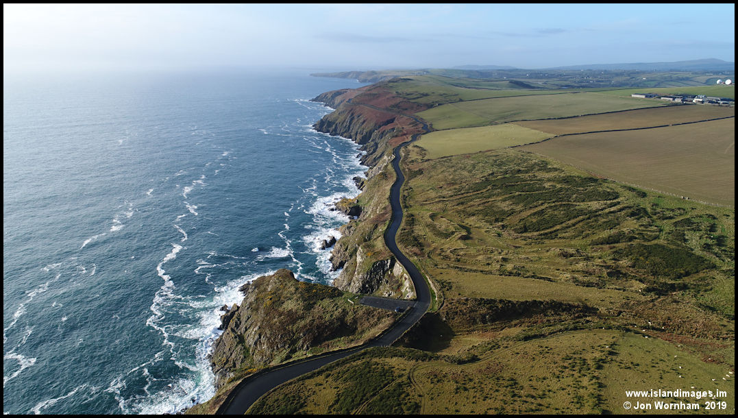 Looking south as the Marine Drive twists and turns on its way to Port Soderick. The area centre foreground now occupied by a car park was the site of the Douglas Southern Electric Tramway's power generating station.