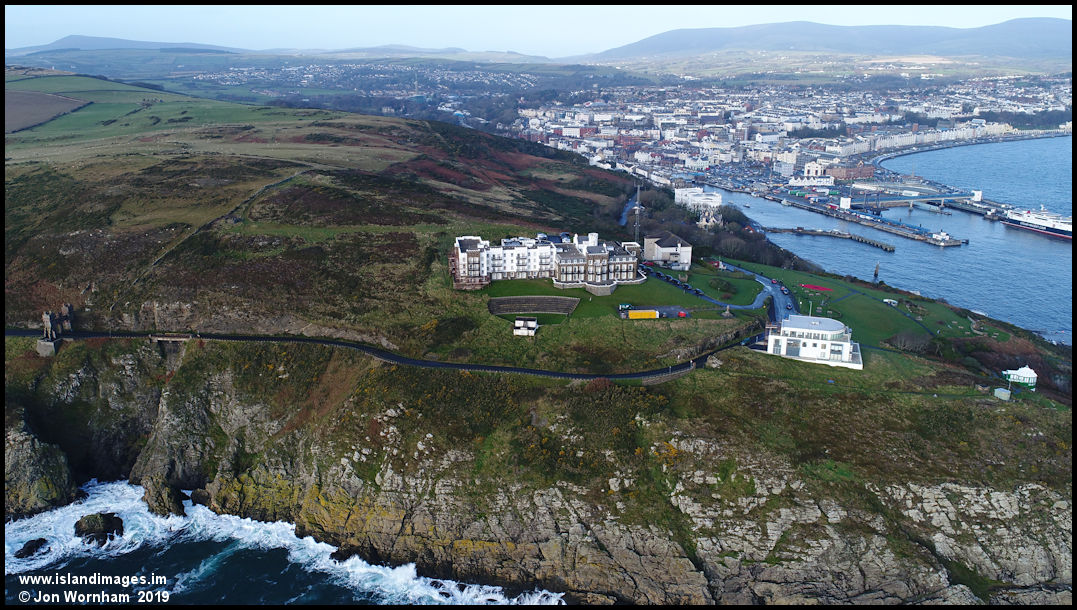 Buildings on Douglas Head. During WW2 this whole area became H.M.S. Valkyrie, training radar technicians and operators for Royal Navy ships. The two sets of apartments now here date from more recent times.