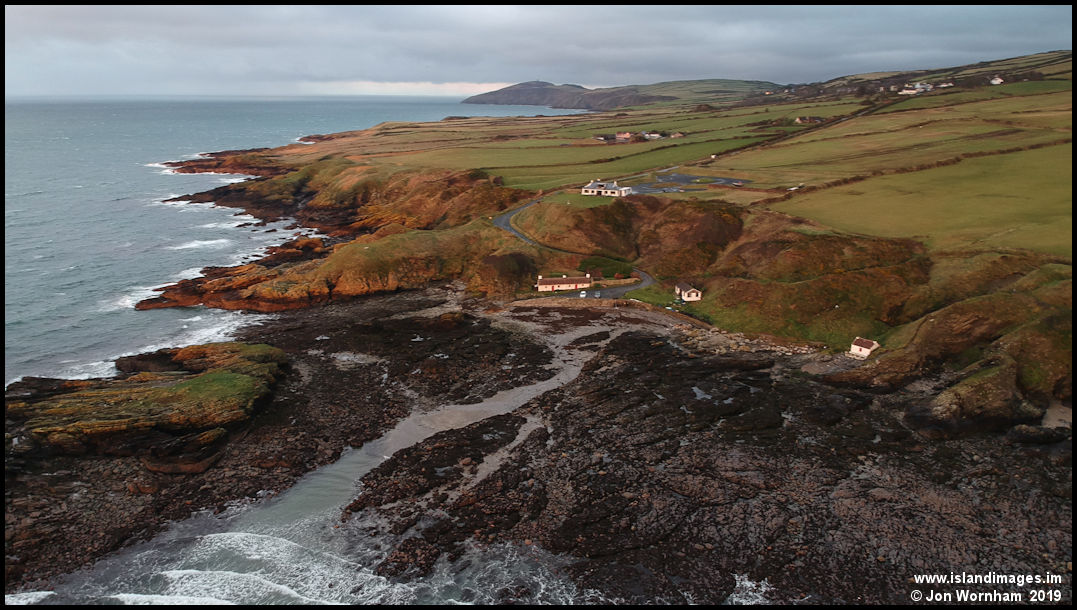 The cottages at Niarbyl, looking north with Peel Hill in the distance.