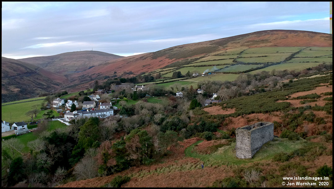 Looking across Agneash and along Laxey Glen to Snaefell. The building in the foreground was a water wheel case serving Dumbell's shaft, part of the Great Laxey Mine.