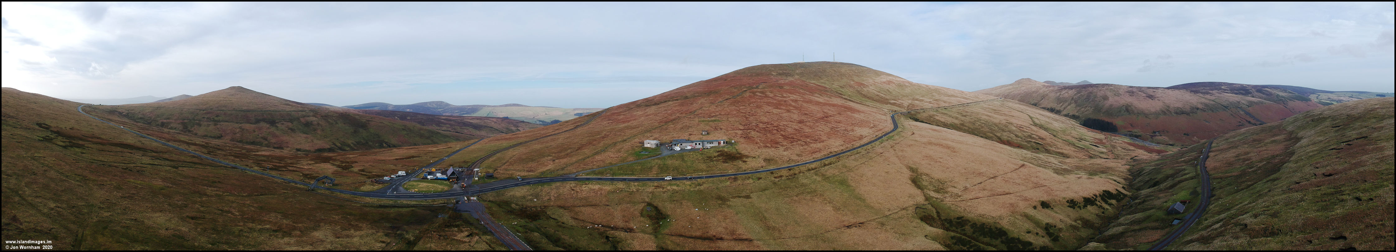 Panorama at Bungalow, taking in Beinn-y-Phott on the left, past Snaefell and to Laxey Glen and the North Barrule ridgeline on the right.