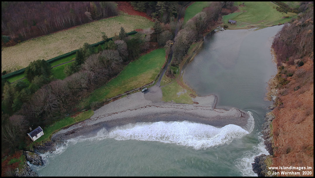 A closer look at the full lagoon. The footpath that normally passes in front of the top cottage is under water.