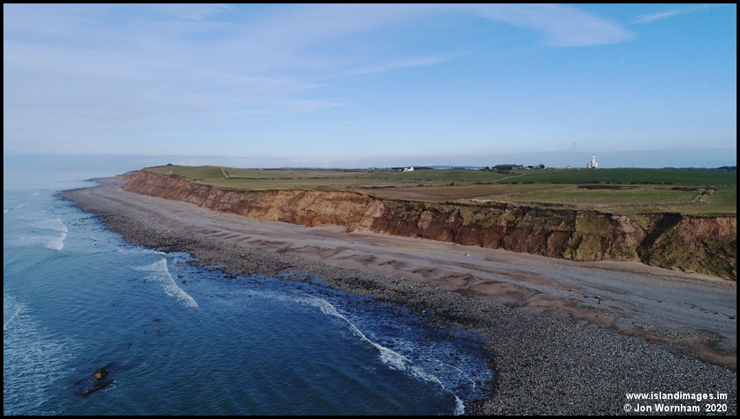 Coastline at Jurby Head, with the church prominent inland.