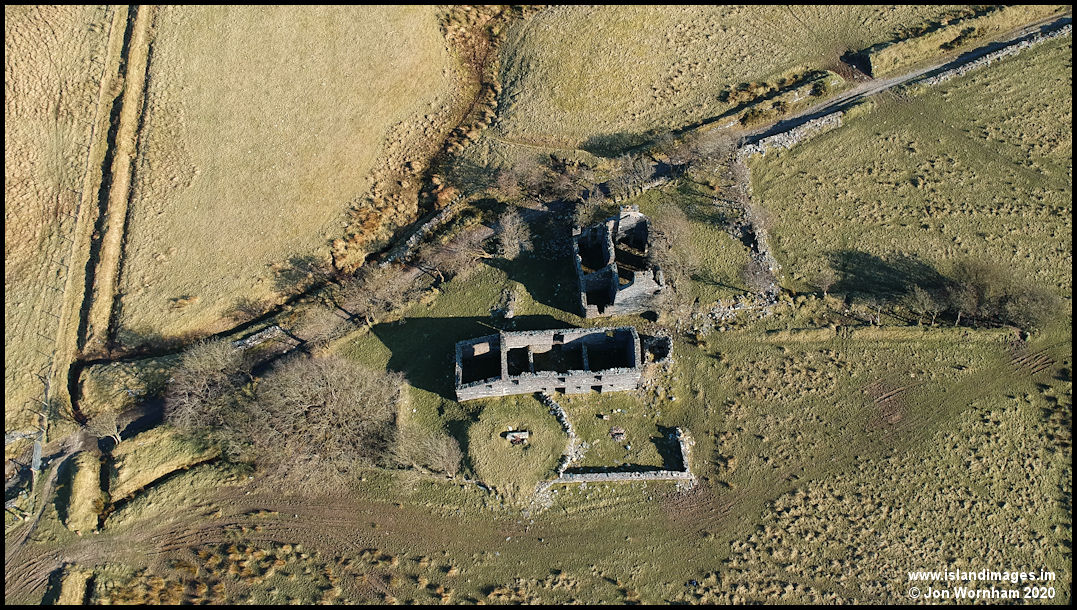 Near vertical shot showing the farmhouse to the top, large barns and the circular horse powered mill, a feature of these upland farms.