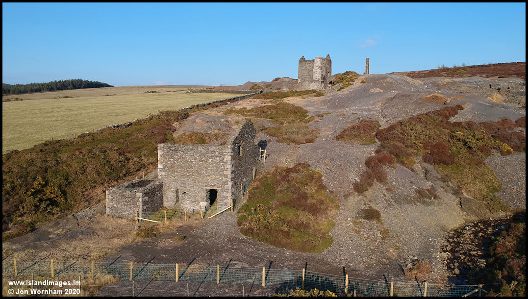 Beckwith's Mine. Most of the remaining buildings can be seen in this shot, the nearest one is a machine house with water wheel casing to the left.