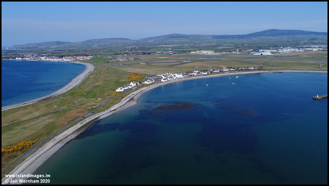 Turning the camera around for a look at the narrow spit of land that joins Langness to the mainland. Ronaldsway Airport is behind the houses of Derbyhaven and Castletown on the far left.