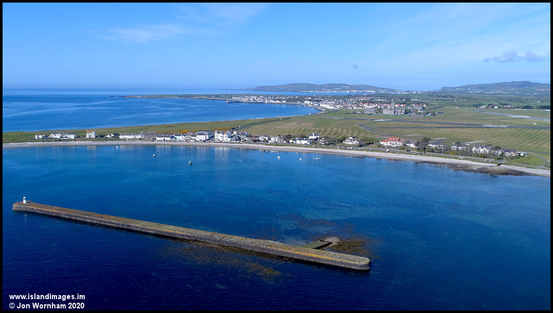Looking across the breakwater to the houses of Derbyhaven, with Castletown in the distance.