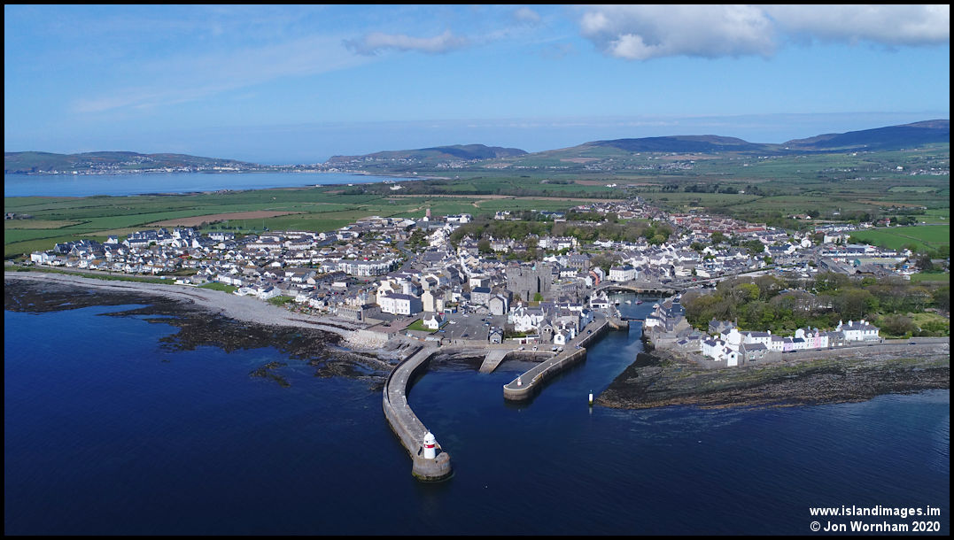 Pulling the viewpoint back again to look into the harour entrance and across the town.