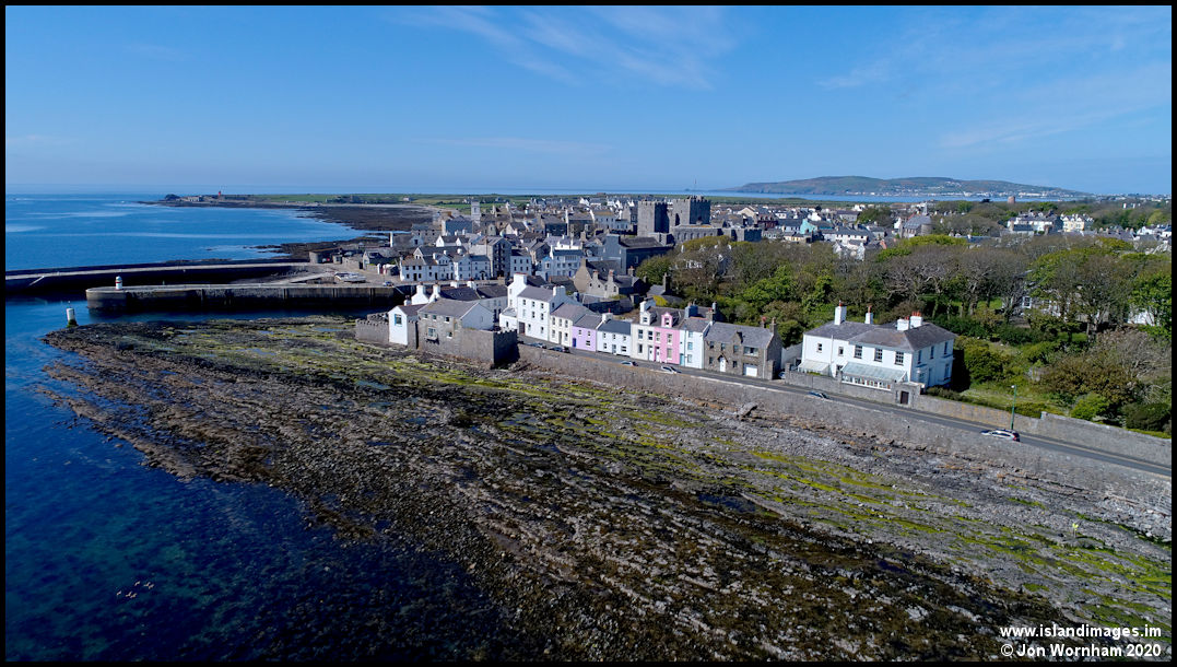 A lower level view of the colourful houses on Douglas Street with Castle Rushen behind.