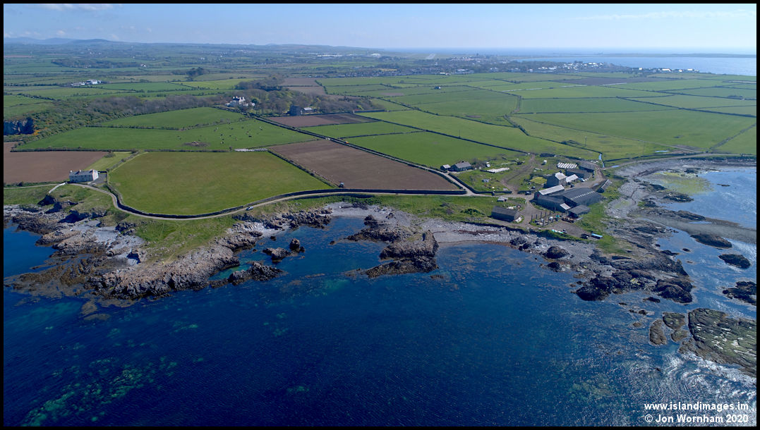 An overall view at Pooil Vaaish where a narrow road winds around the coast. Ronaldsway Airport's runway 08 can be seen in the distance.