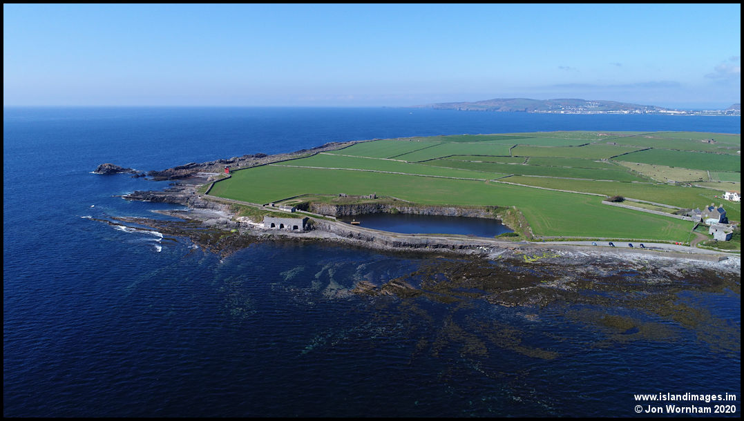 Looking across Scarlett then Bay ny Carrickey with Port St Mary in the distance. The 'lake' behind the coast track is a former limestone quarry and the shorelne building a limestone kiln.