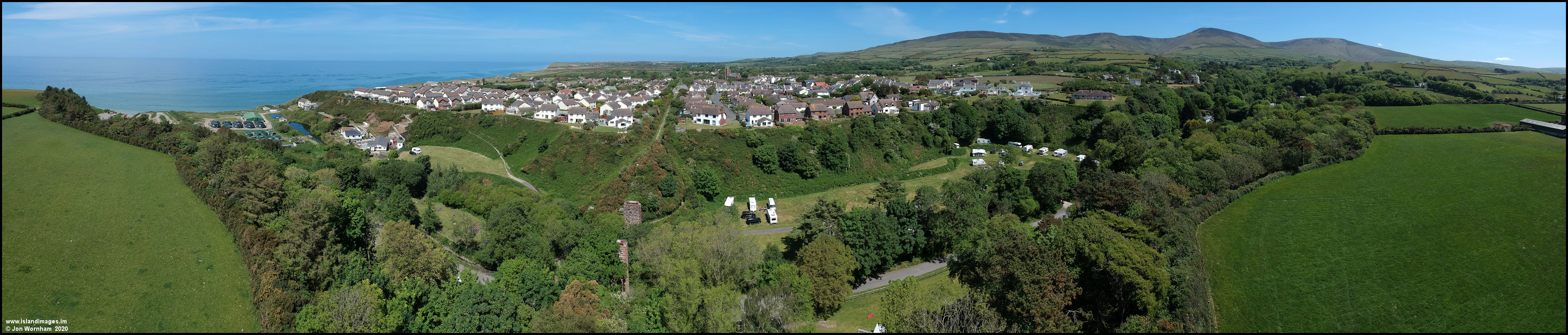 Panorama looking across Glen Wyllin to Kirkmichael. The Manx Northern Railway used to cross the glen on a high viaduct, but today only the stone supporting pillars survive.
