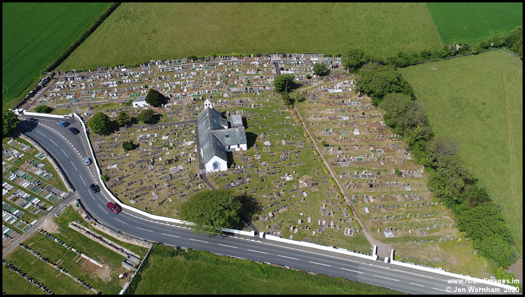 A more vertical view of the older parts of the graveyard surrounding Malew parish church, St Lupus.