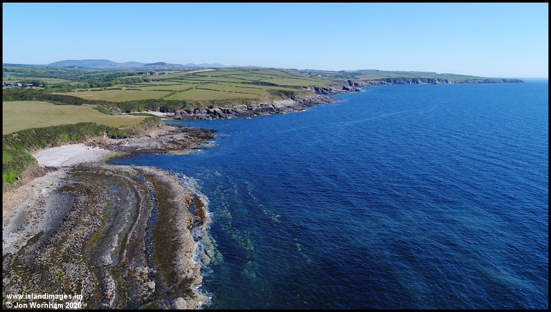 Looking across the limestone rocks and a small stoney beach just to the south of the Santon Gorge, then along the coast to Santon Head.