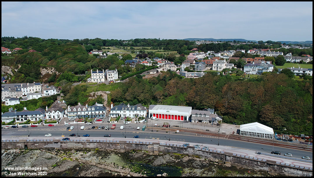 Flying to a higher altitude to take in more of the scene at Derby Castle. The white 'building' on the right is the temporary marquee type construction that was a temporary depot for the horse trams while the old depot was demolished and rebuilt.