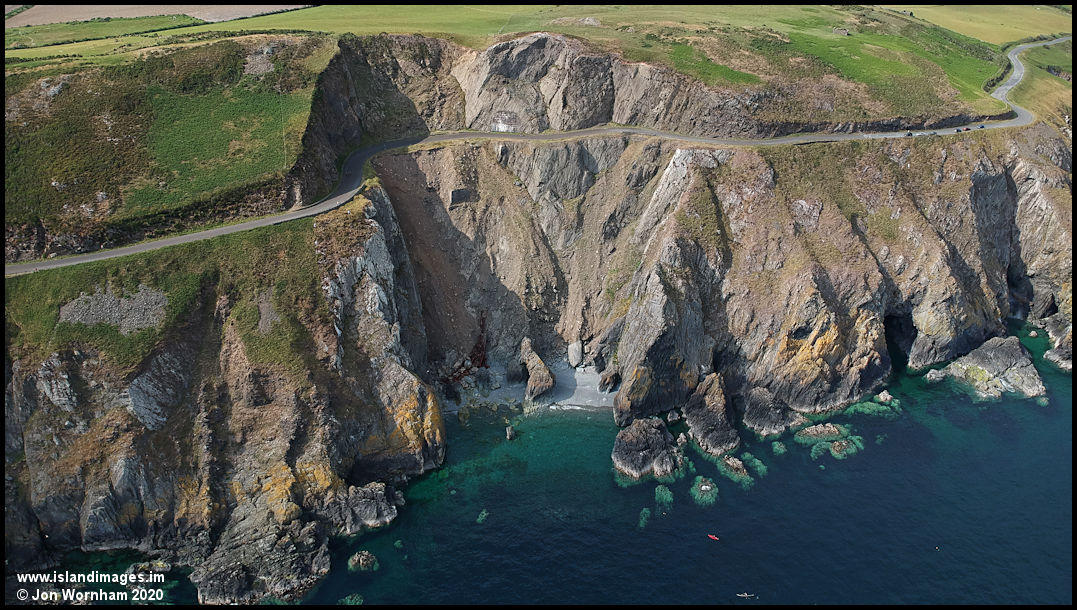 The Marine Drive winds around, high above the sea at Port Wallberry. The Douglas Southern Electric Tramway used to cross here on a narrow viaduct.