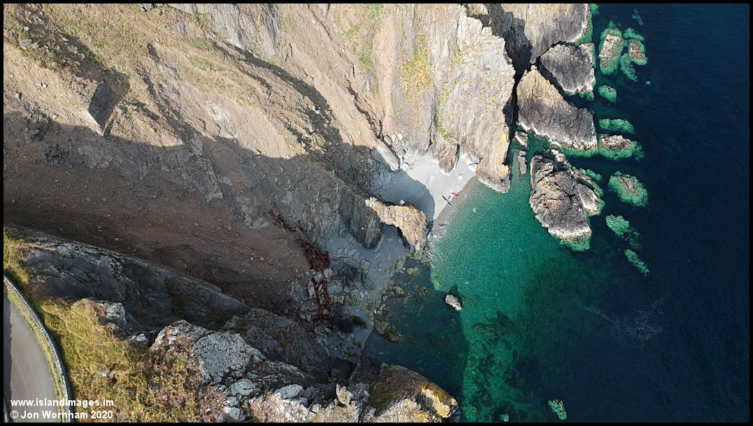 Looking almost vertically down to the beach at Port Wallberry. Remains of the DSET viaduct lie on the beach and the centre support can be seen top left of picture.