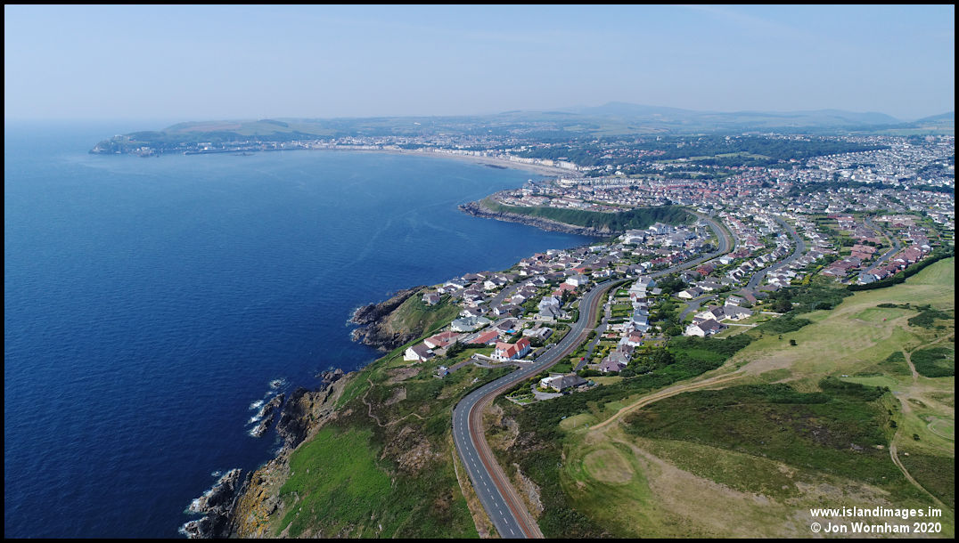 Looking along King Edward Road in Onchan with the Manx Electric railway running alongside, then across the bay to Douglas Head, a bit hazy in the distance.