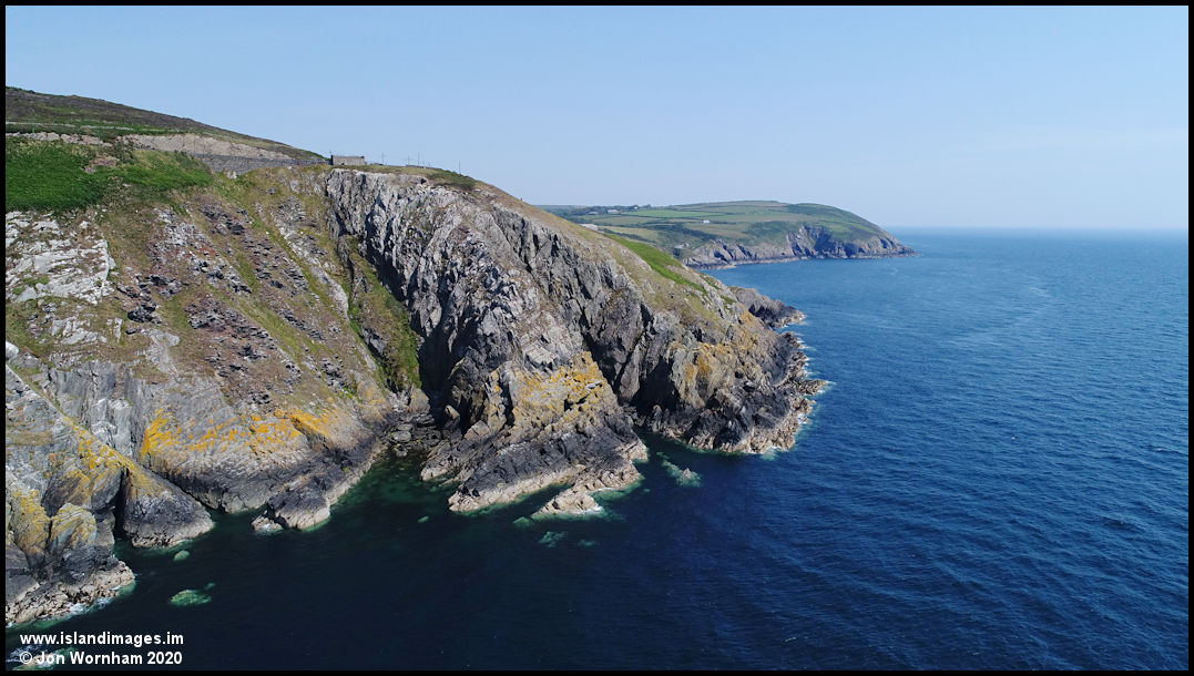 A lower level view of the cliffs at Howstrake. The building on top was the shelter for holiday camp guests waiting for Manx Electric Railway trams to take them into Douglas.
