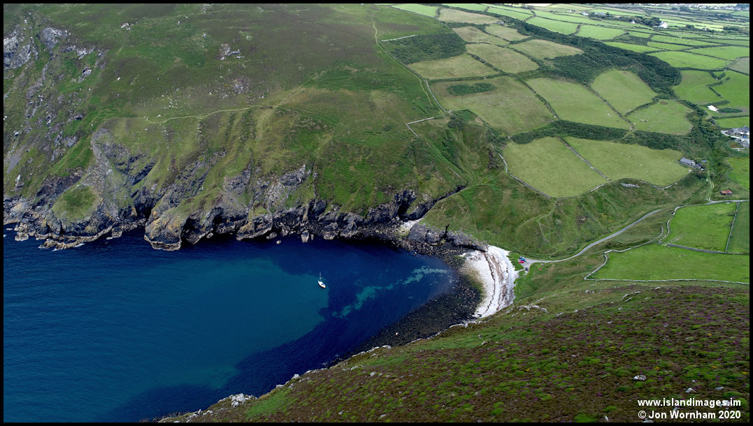 Flying the drone up the steep slope of Bradda for this view back down to the beach.
