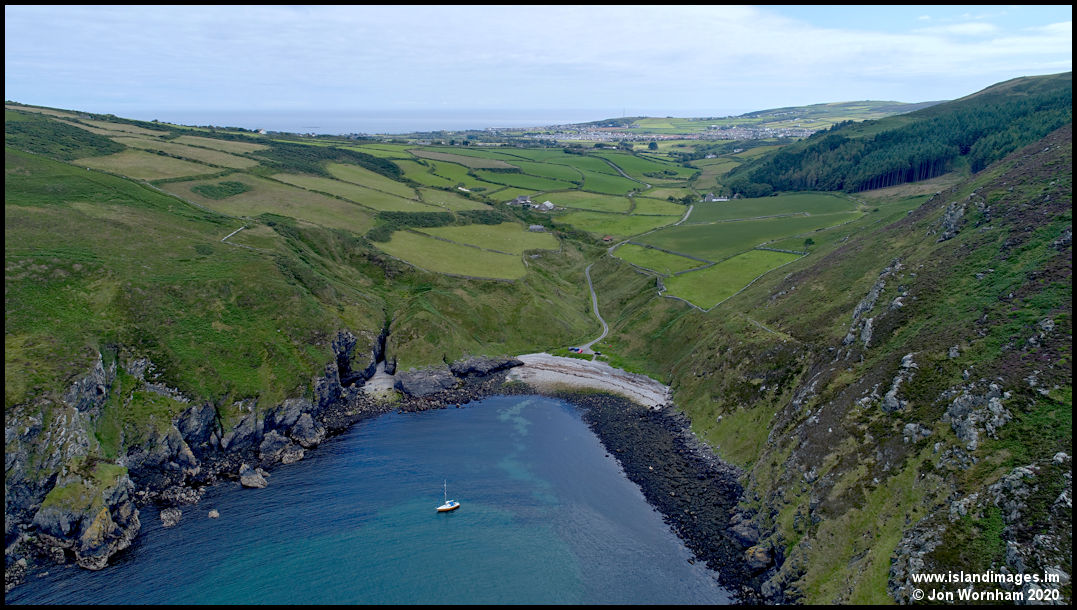 The sailing boat at anchor in the bay provides a nice addition to this view inland, with the towns of Port St Mary and Port Erin in the distance.