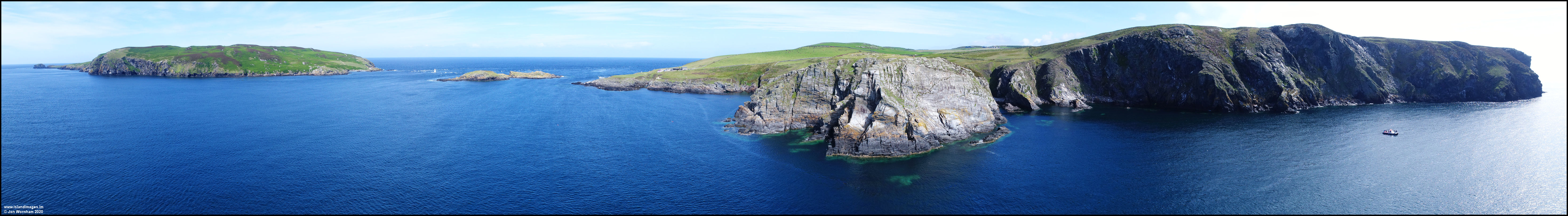 A lower level panorama centred on Burroo Ned, looking from the Calf of Man on the left, to Spanish Head on the right.