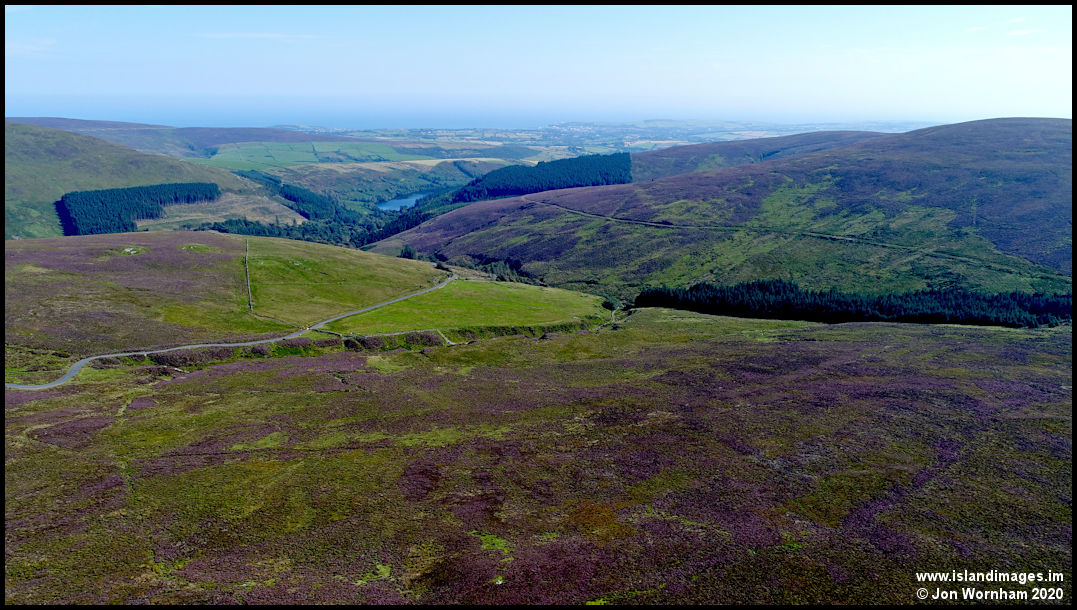 The view from above Slieau Maggle, looking down towards Injebreck and the reservoir. Onchan and Douglas are in the distance, but more or less lost in the haze.
