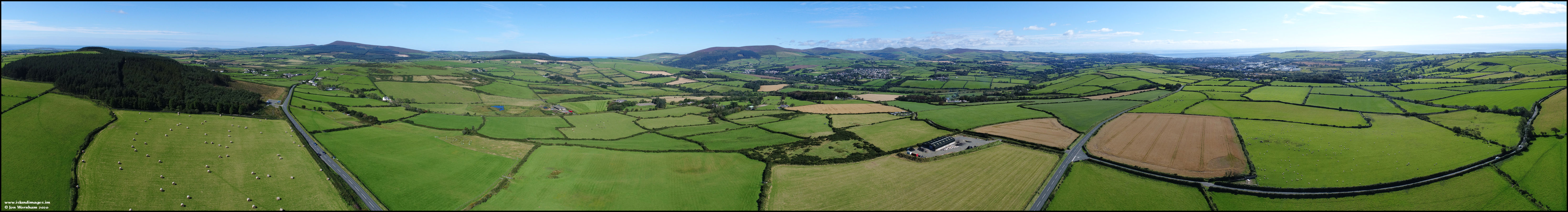 A wide area panorama of the area around The Braaid, with Chibbenagh Plantation on the left, then the current hamlet of Braaid, past the ancient site of The Braaid and village of Glen Vine, with Douglas towards the right.