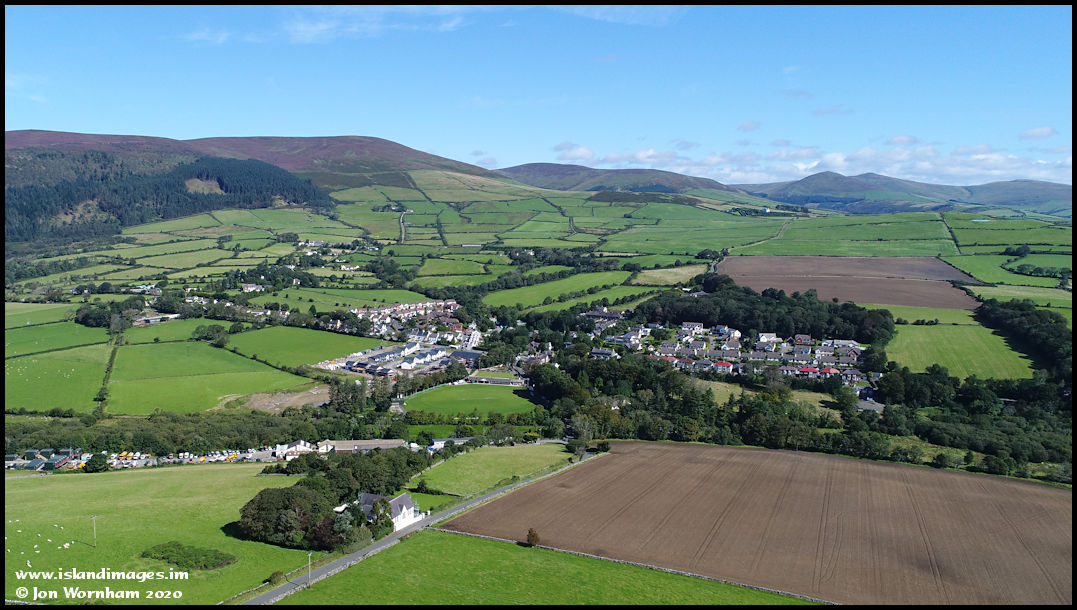 The village of Crosby, about half way between Douglas and Peel in the central valley. The white building in the foreground was the old village school, a steep climb up every morning for the schoolchildren!