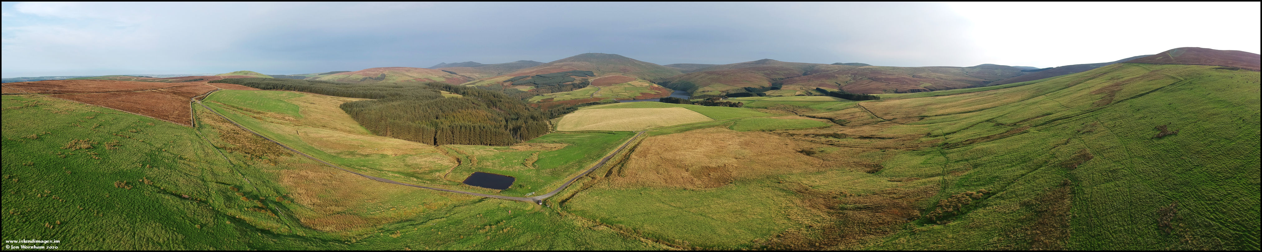 Panorama looking across the moorland from the Druidale Road, where it takes an almost 90 degree bend above Tholt-y-Will Plantation, looking down across the plantation to Sulby Reservoir and Snaefell