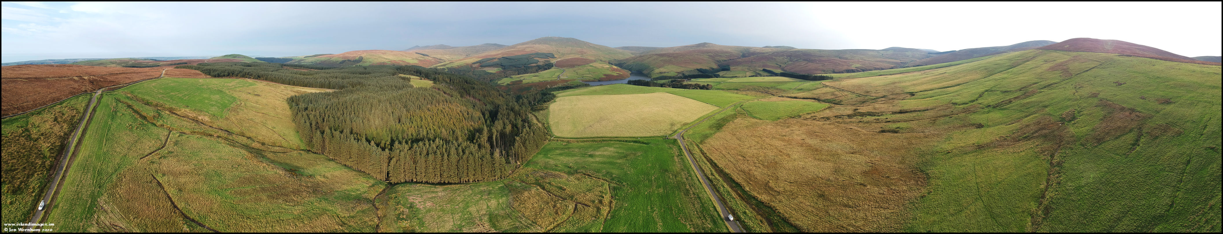 A similar view to the previous one, bu flying the drone closer to the plantation. The Druidale road (and the same white van!) appears on both side of the panorama.