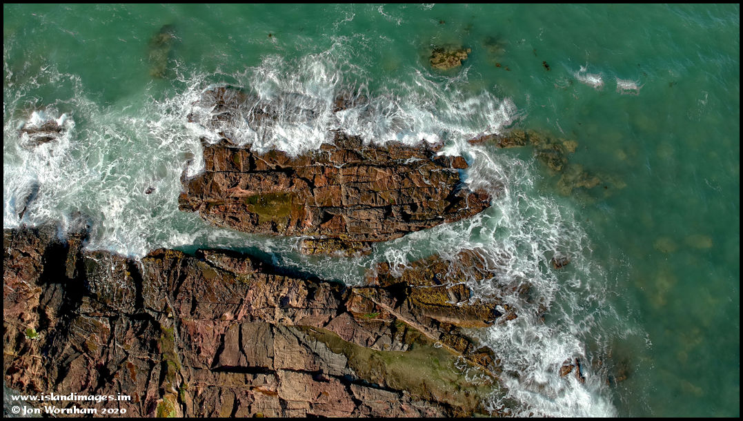 Looking almost vertically down on the rocks that define the southern edge of the bay. A lot of the rock here has a definite pink colour and can be seen used in some buildings in Peel.