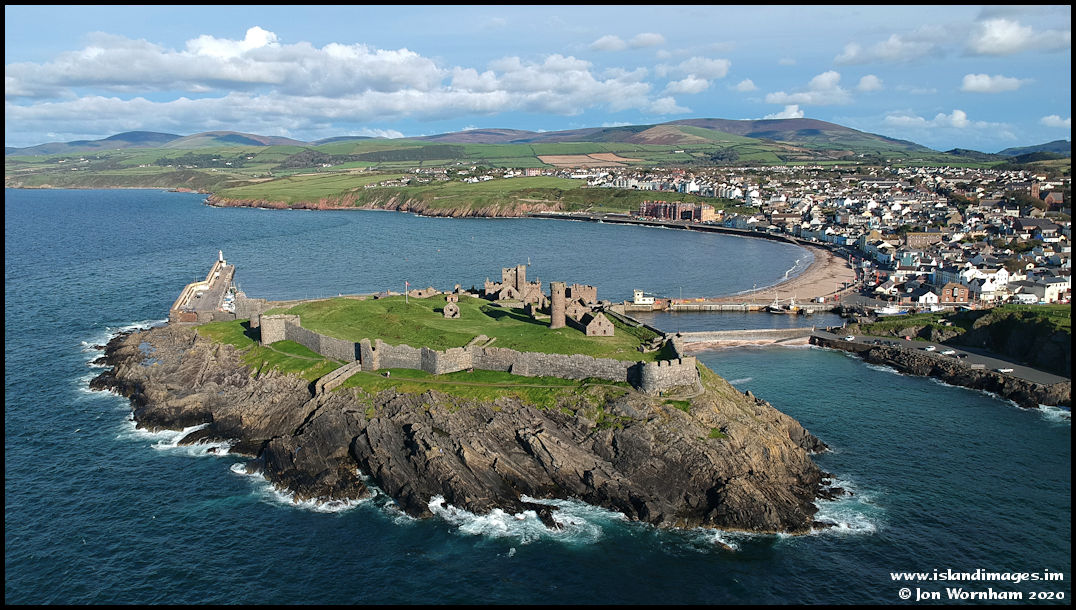 Peel Castle on St Patrick's Isle, linked to the mainland by a causeway that created Fenella Beach.