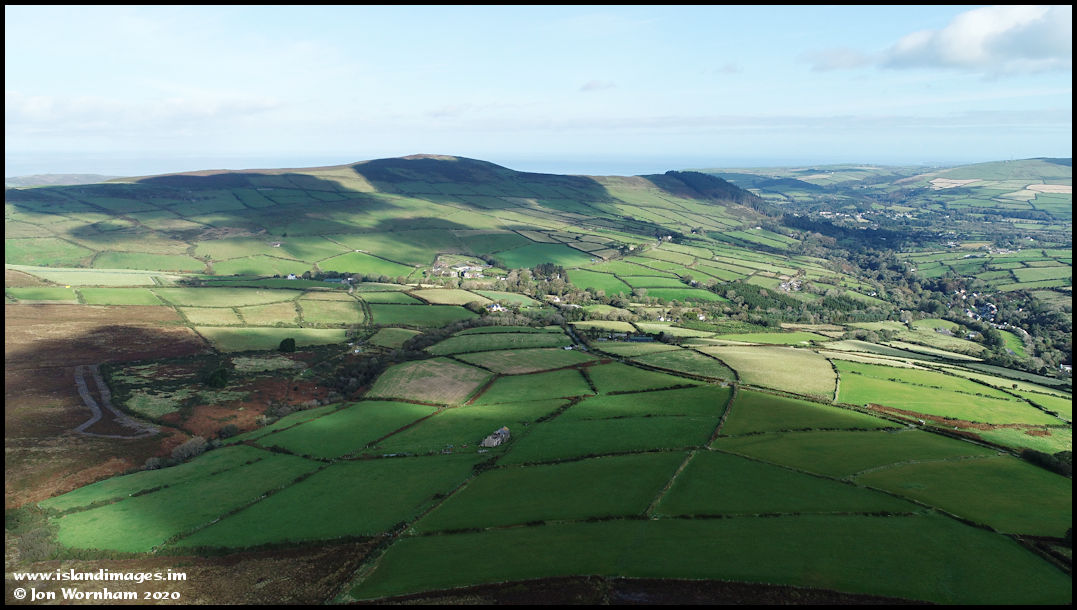 Turning the camera more to the left and looking across the farmland to the west of the Foxdale valley with Slieau Whallian central in the distance.