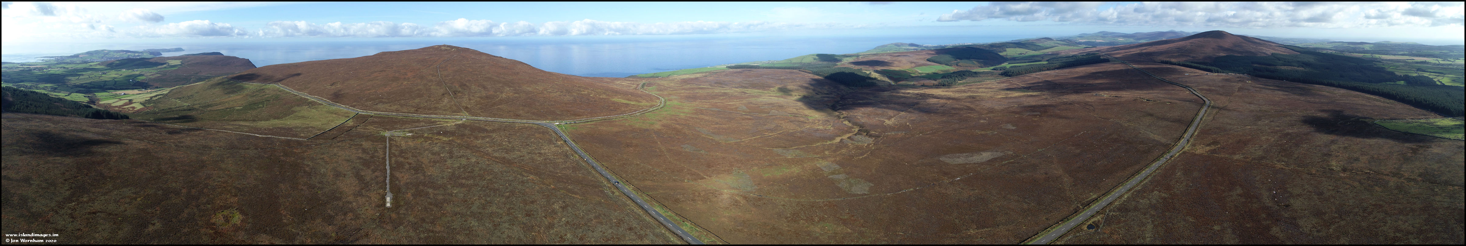 A composite stitched panorama looking from Port St Mary on the left, past Cronk-ny-Arrey-Laa and the radio station, then to Glen Rushen and South Barrule.