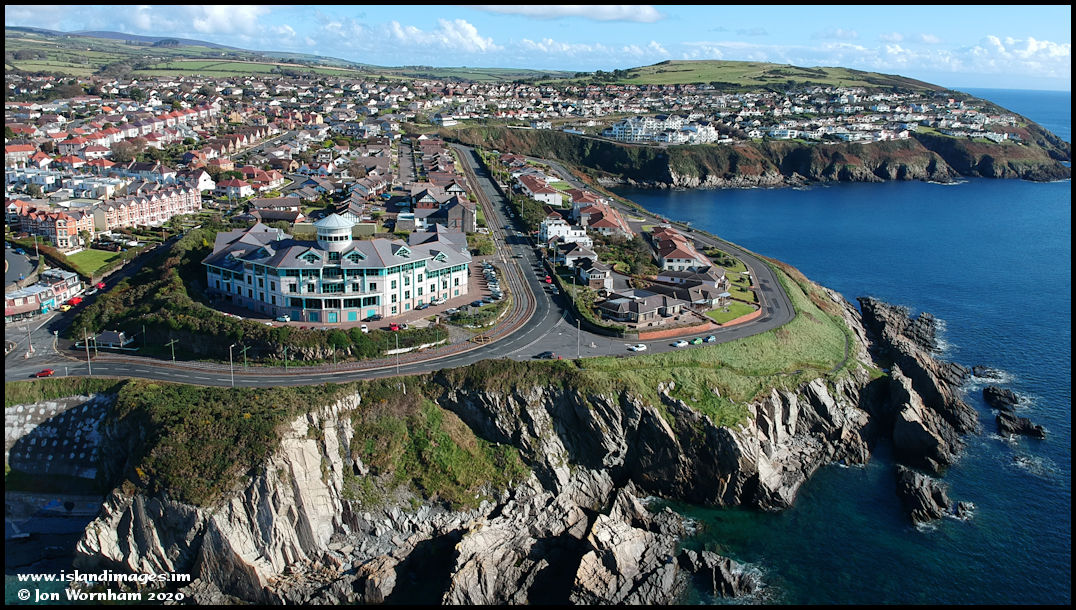 Looking to the north where the Manx Electric Railway curves around the imposing office building that now occupies a former hotel site. The houses on its right are where the White City amusement park once stood.